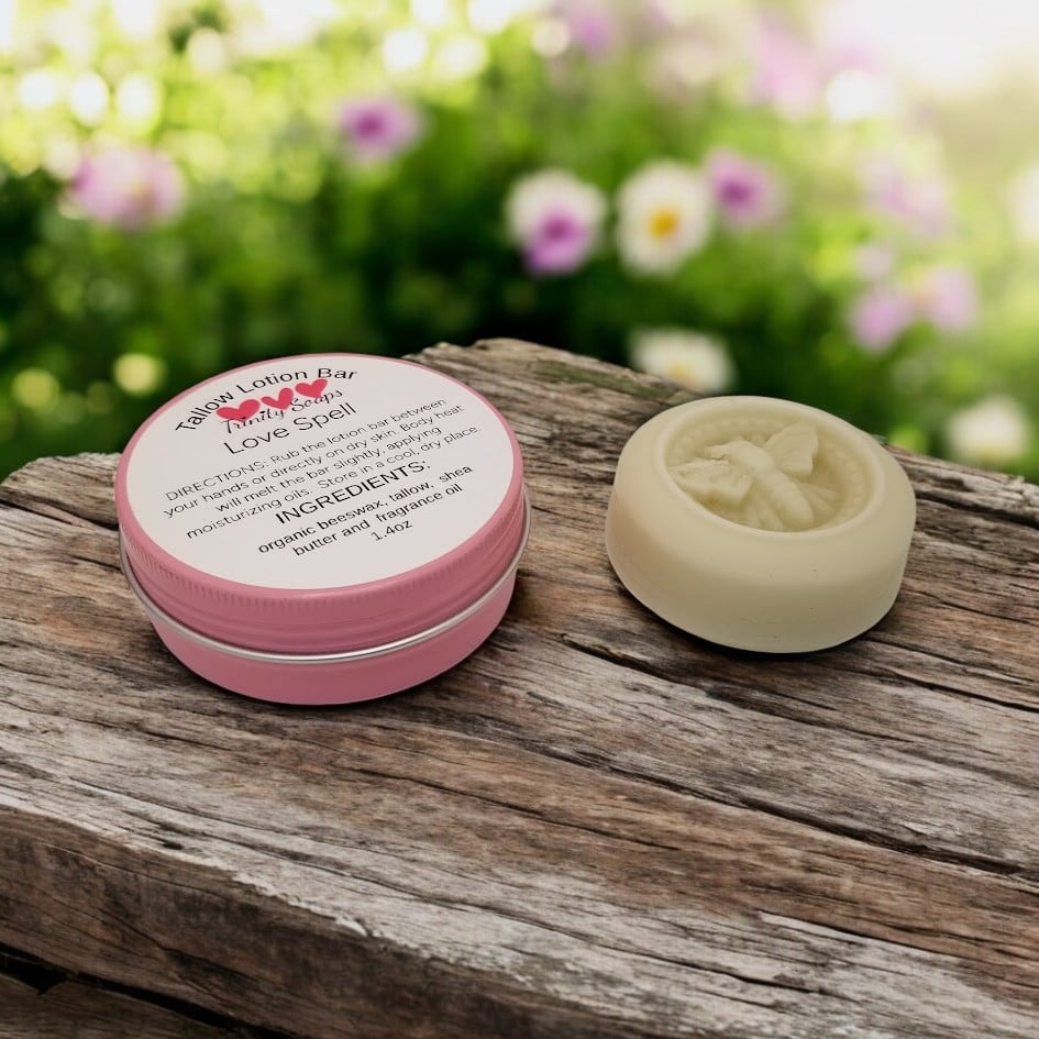 Indulge your skin with our Lotion Bars, handcrafted to nourish and hydrate with the finest natural ingredients. Each 1.4-ounce bar is made with organic beeswax, grass-fed tallow, and organic shea butter, creating a rich, moisturizing blend that melts into your skin for long-lasting softness. Choose your sensory experience with either a fragrant essential oil or a delightful fragrance oil, carefully selected to elevate your self-care routine. Packaged in an elegant pink tin for women's scents or a silver tin for men's and neutral type scents, these compact bars are perfect for on-the-go hydration, leaving your skin silky smooth without any greasy residue. Purely natural, luxuriously simple—your skin deserves this.